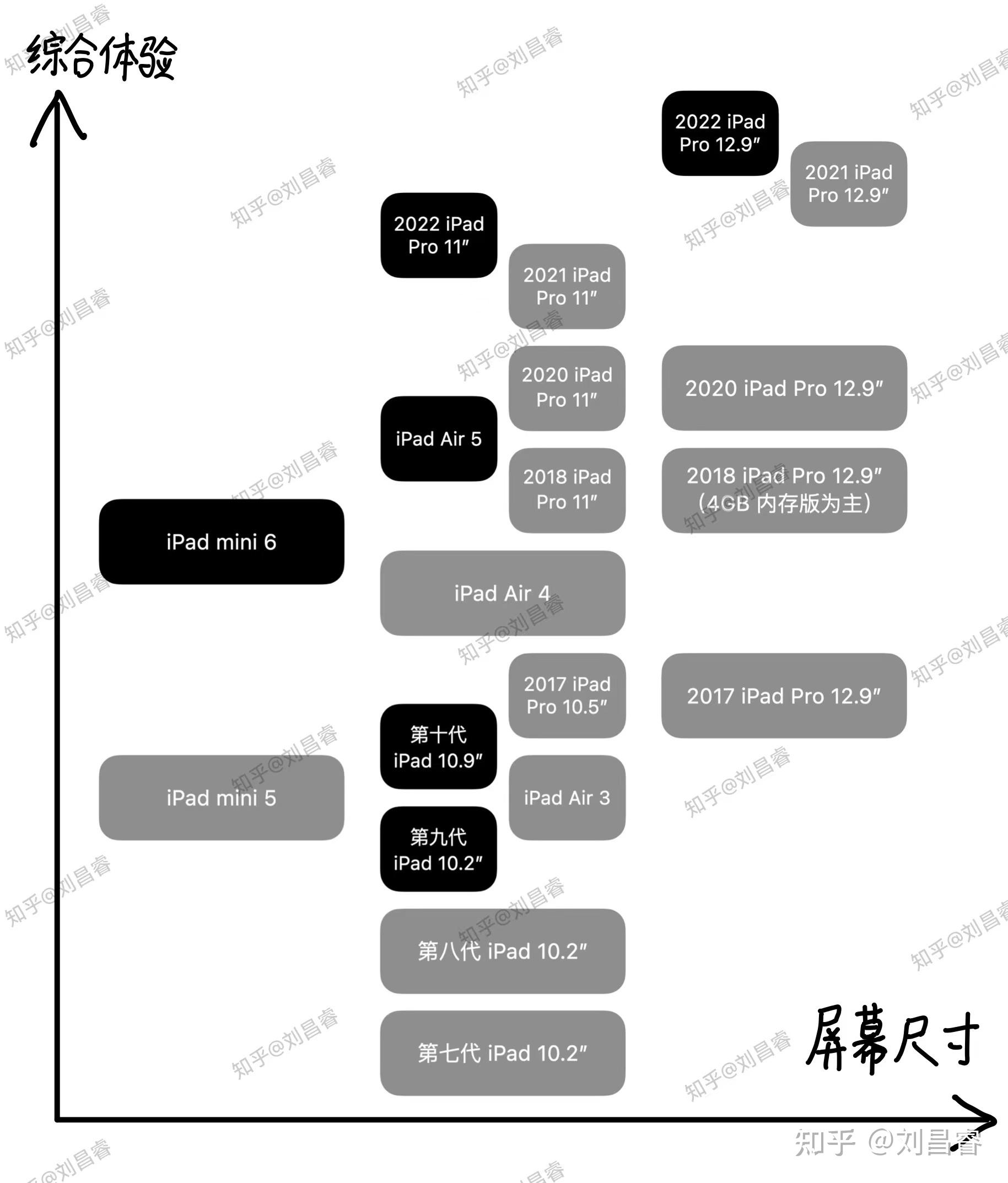 横轴为屏幕尺寸,纵轴为主观综合体验水平(黑色表示官网在售,灰色表示已下架)