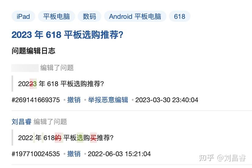 今年 618 即将开始,我搜了些平板相关的准备开写,突然看到一题明明是问 2023 但第一个就是我的回答(我心想不对啊 今年还没写呢)看了编辑日志才明白,是有人把 2022 改成了 2023,结果我一年前的回答还排在榜首,这下不写不行了(笑)