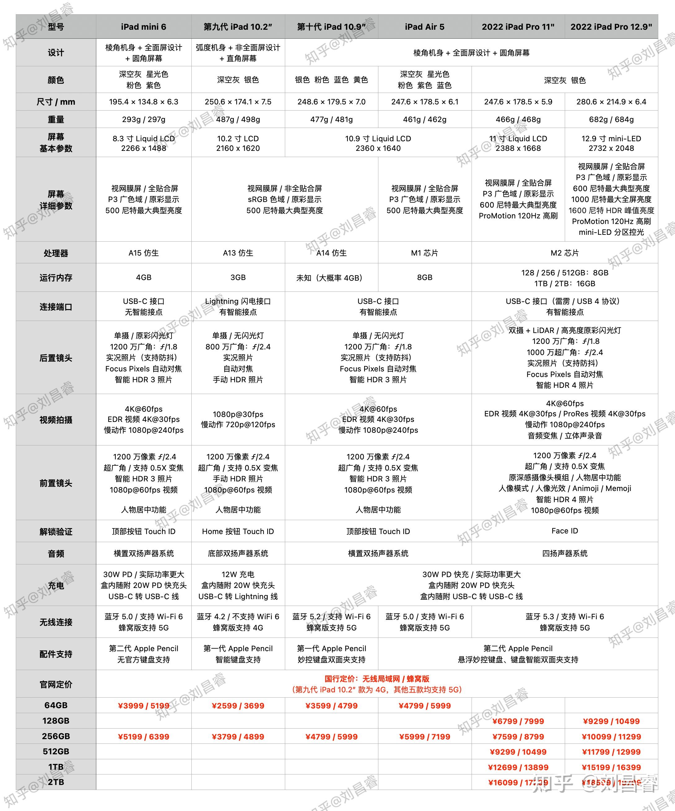 看完产品定位,再来看硬核的参数对比,6 款在售 iPad,一张表格就讲清楚了