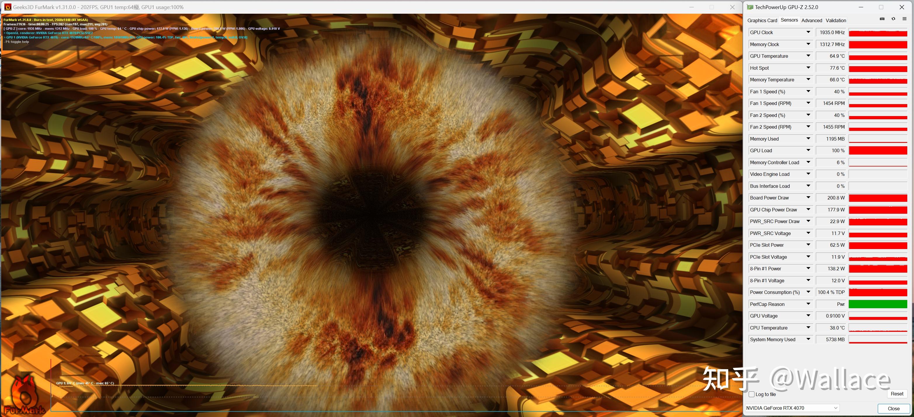 压力测试软件采用软件Furmark,俗称烤甜甜圈,并且用GPU-z监测实时温度。在压力测试10分钟之后,GPU核心温度到了64.9摄氏度,显存温度66.6摄氏度,相应的显卡功耗为200.08 W左右,显存频率维持Boost频率在1935 MHz的水平,温度控制一般般。