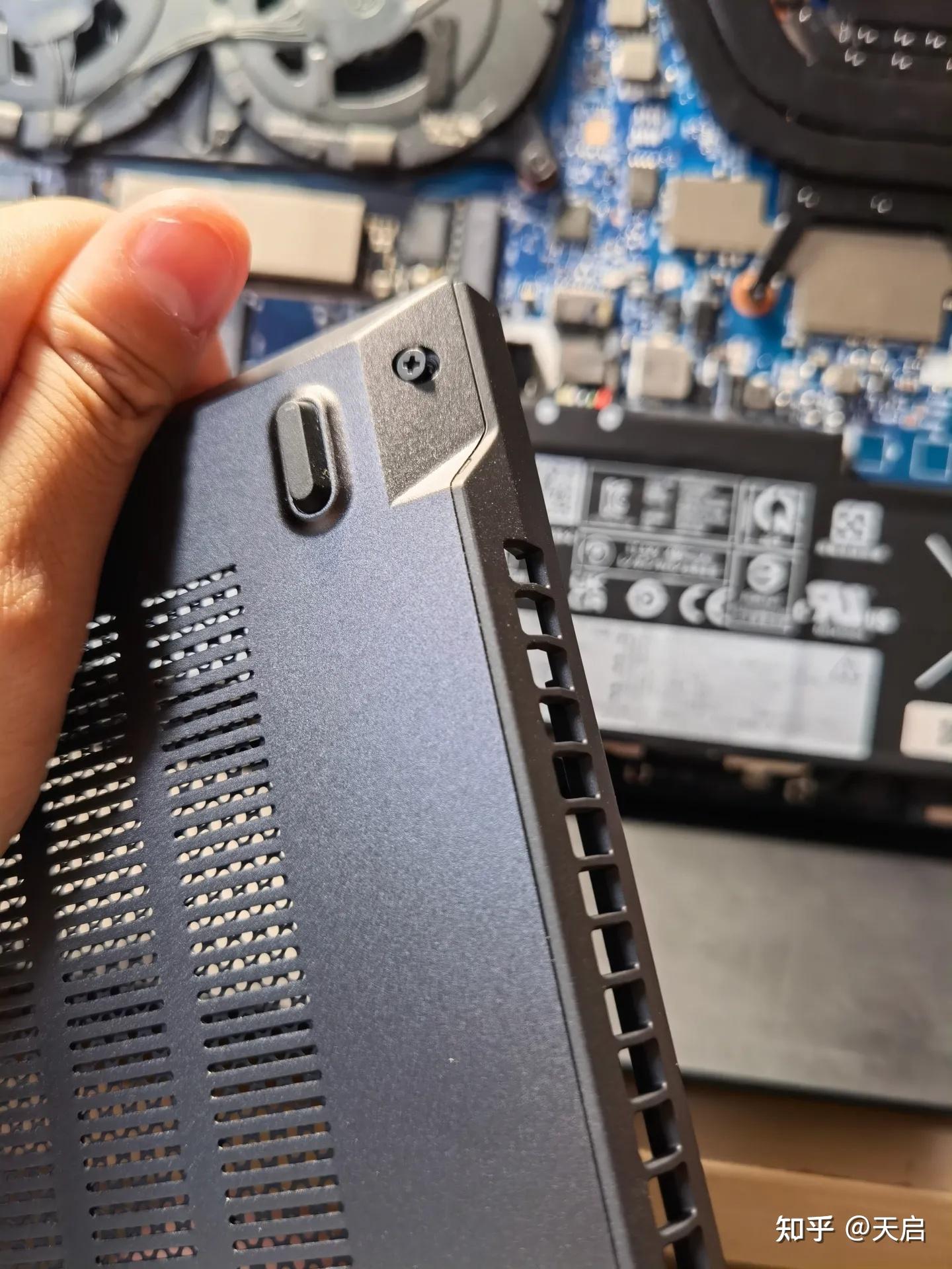 本机的拆解稍微有点难度,主要是有两点需要注意的地方。首先是D壳的金属部分和后部出风口处的塑料件是一体的,如果错误的从D壳与出风口塑料件的中间开始翘,就会损坏机器,其次,这机器要从D面下部开始打开才比较方便,和一般的笔记本正好相反。