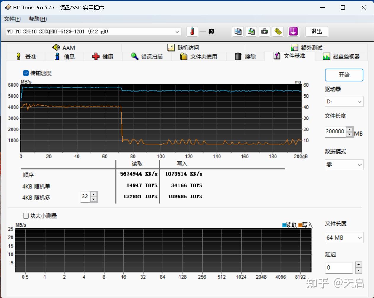 缓存部分使用HD Tune进行测试,这块512G的SN810在持续写入了大约66G的时候出缓,但是缓外写入速度依然表现很不错,在800-1000m/s中波动,算是现阶段旗舰级TLC应有的表现。