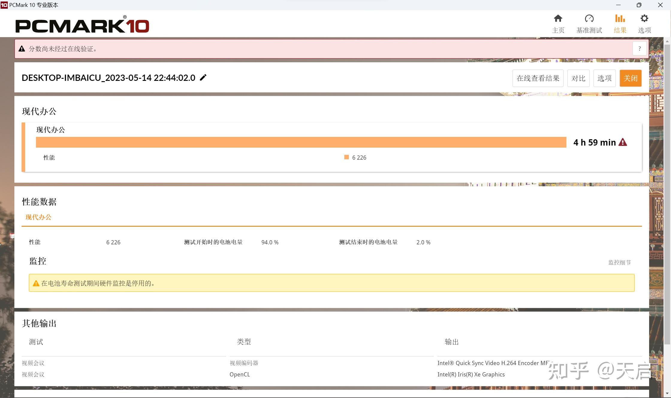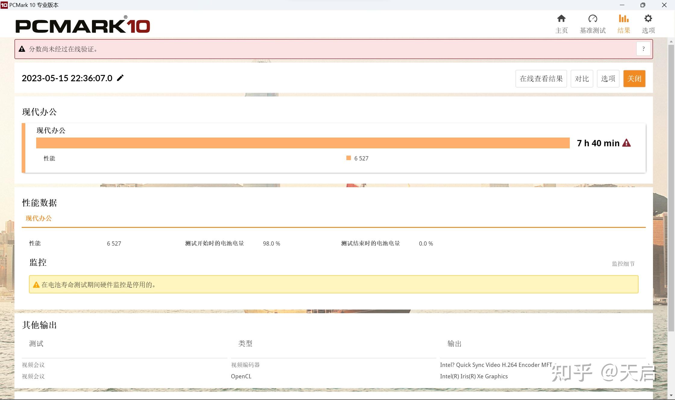 而在生产力环节,PS就是酷睿处理器和Iris Xe核显的主场了,比较可惜的一点是本机的内存只有16G,因此只得到了881分(也足够完成绝大多数的修图工作)也算情理之中。但是PR因为没有独显的CUDA加速,想靠核显做就实在是比较困难了,467分的成绩剪个vlog够,再往上就费点劲。还是更建议买带RTX独显且散热更强劲的机型的(当然32G内存也最好配够)。
