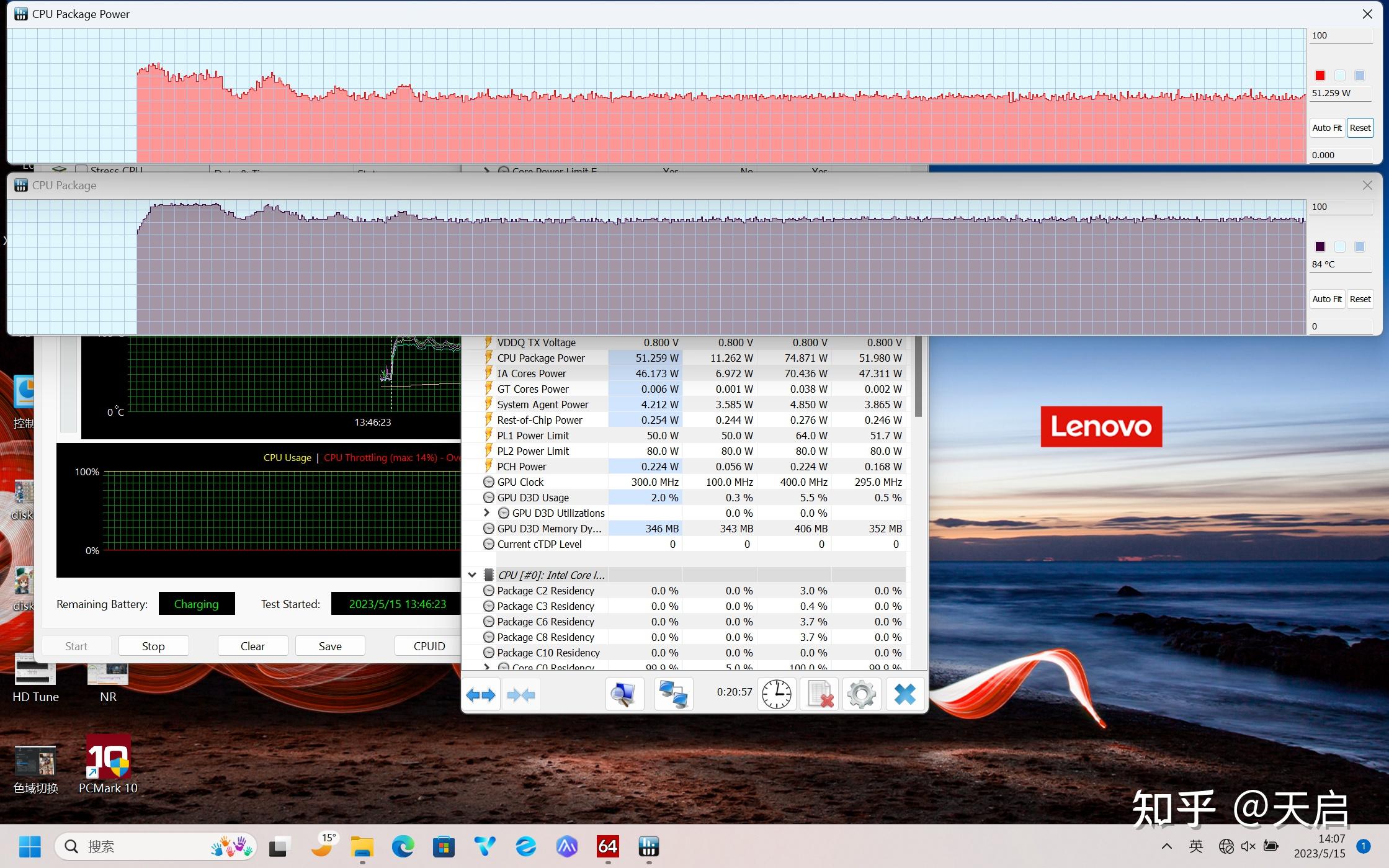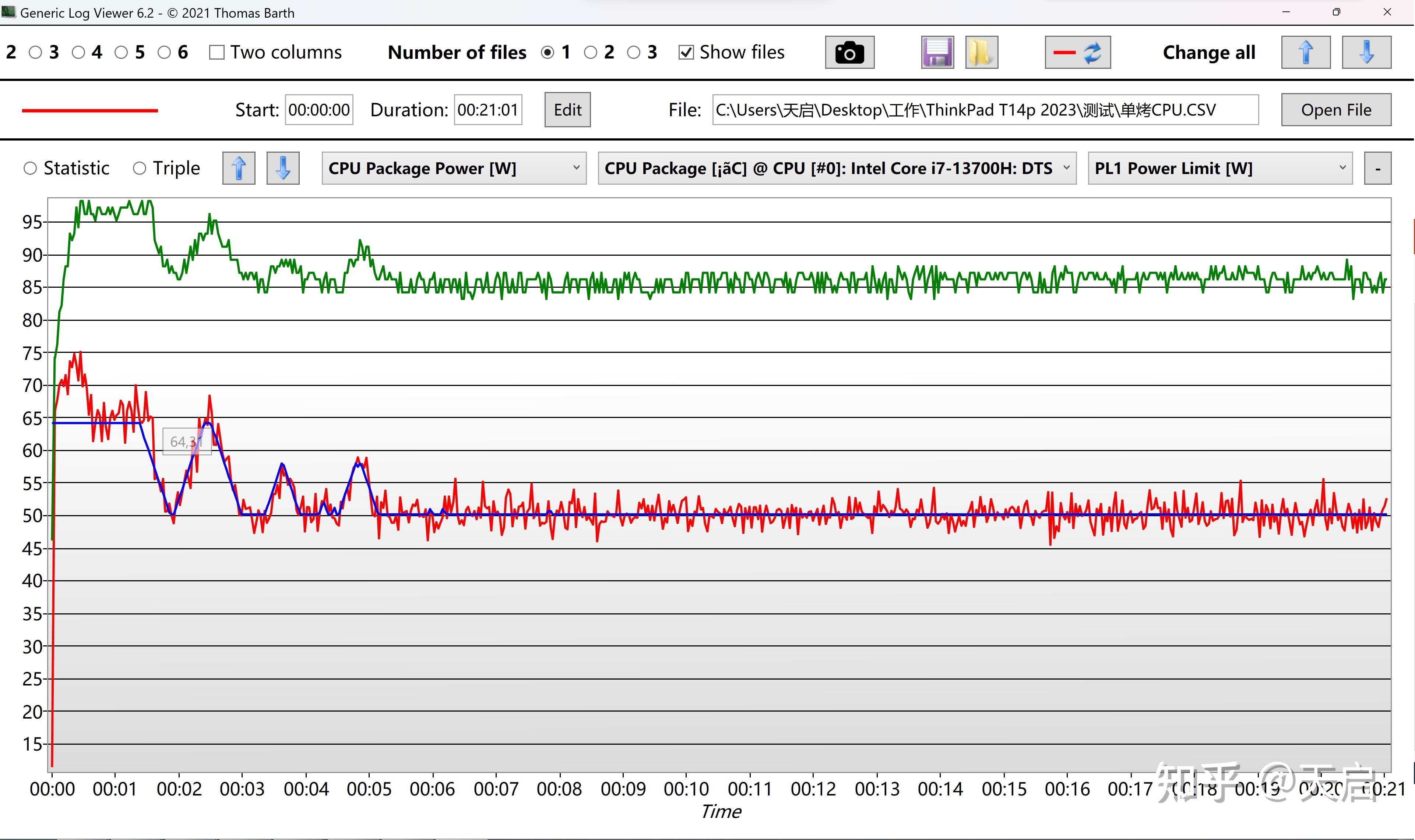 单烤FPU,ThinkPad T14p的CPU功耗在最开始能给短暂的摸到75w的最高值,随后会先在65w保持一段时间,随后在50-65w,50-57w中间来回波动几次,最后稳定在50w的水平上。从红线和蓝线可以看出,这个释放是完全由PL1控制的。而CPU温度则最高能到97度,最后则稳定在85度的水平。