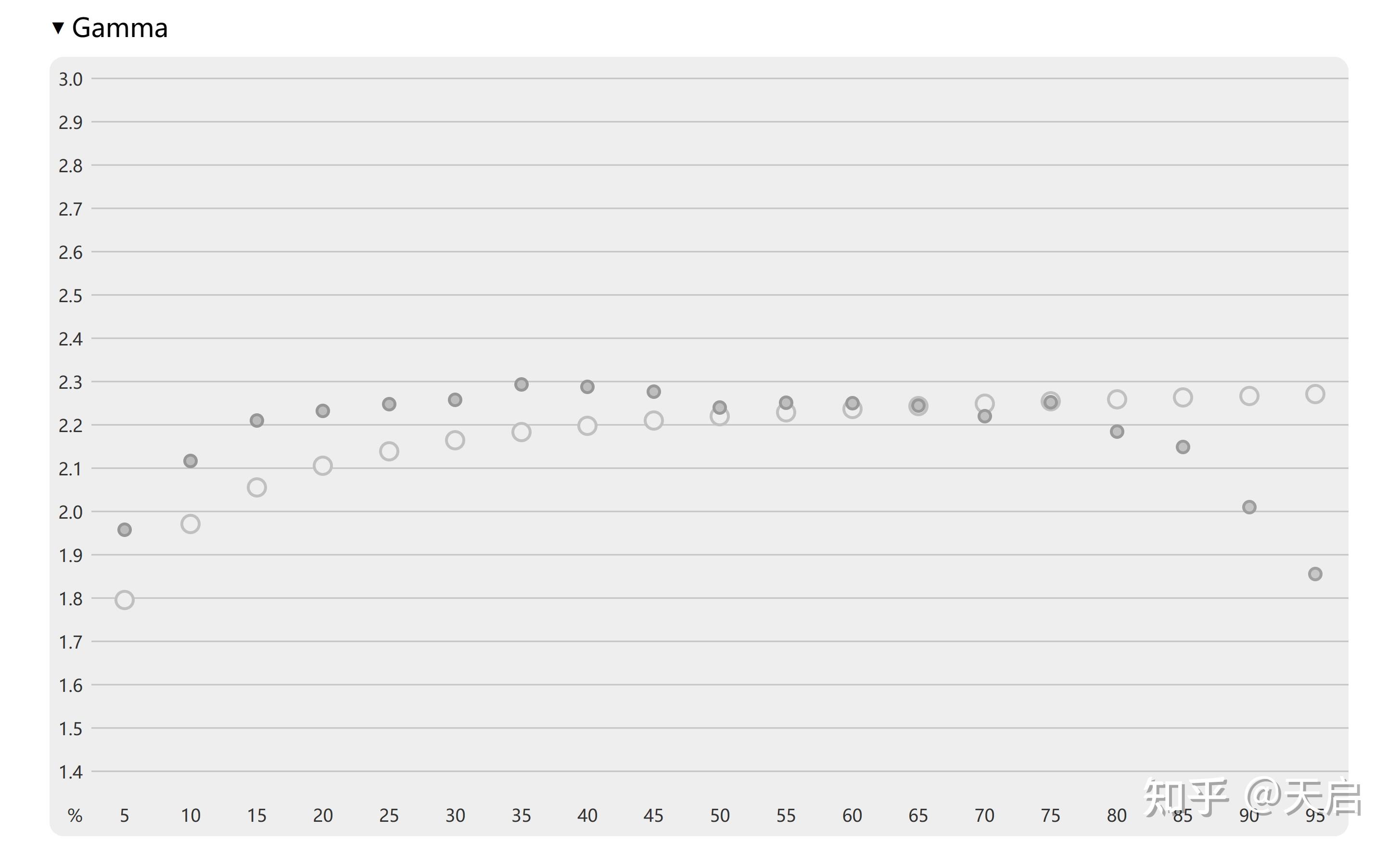 而在伽马值方面,在15%亮度及以上,ThinkPad T14p的这块屏幕的伽马值也都保持在了标准的2.2附近,但是到80%以上的亮度,伽马值就会急速下跌,表现比较一般。