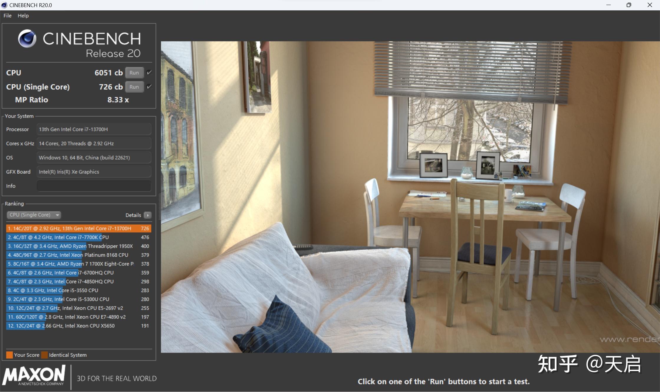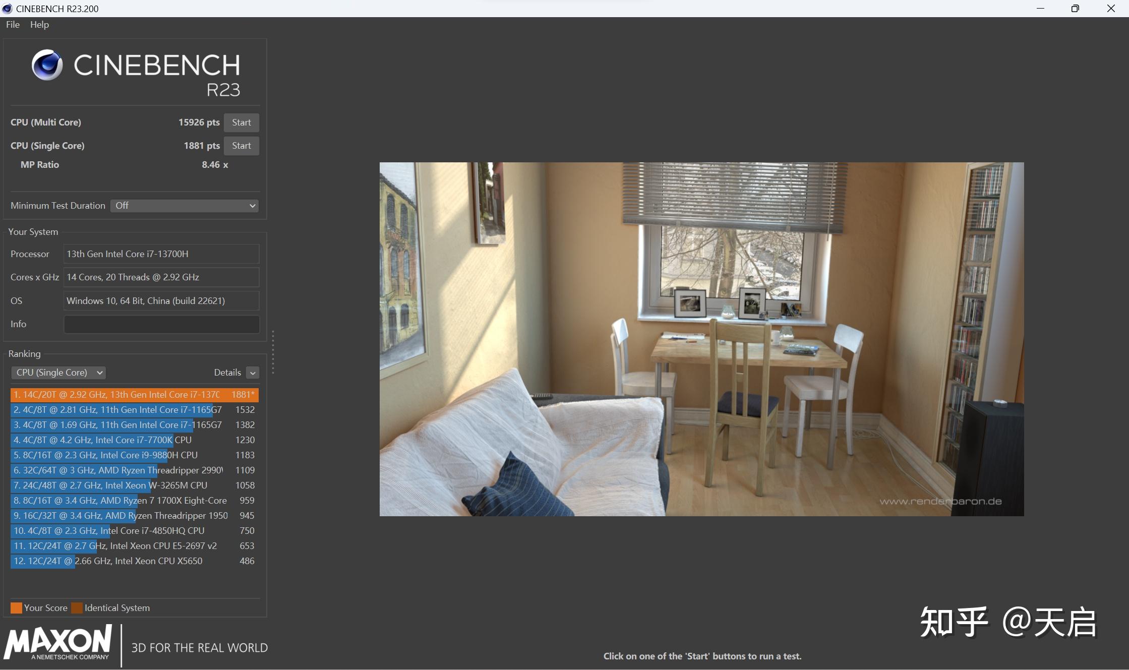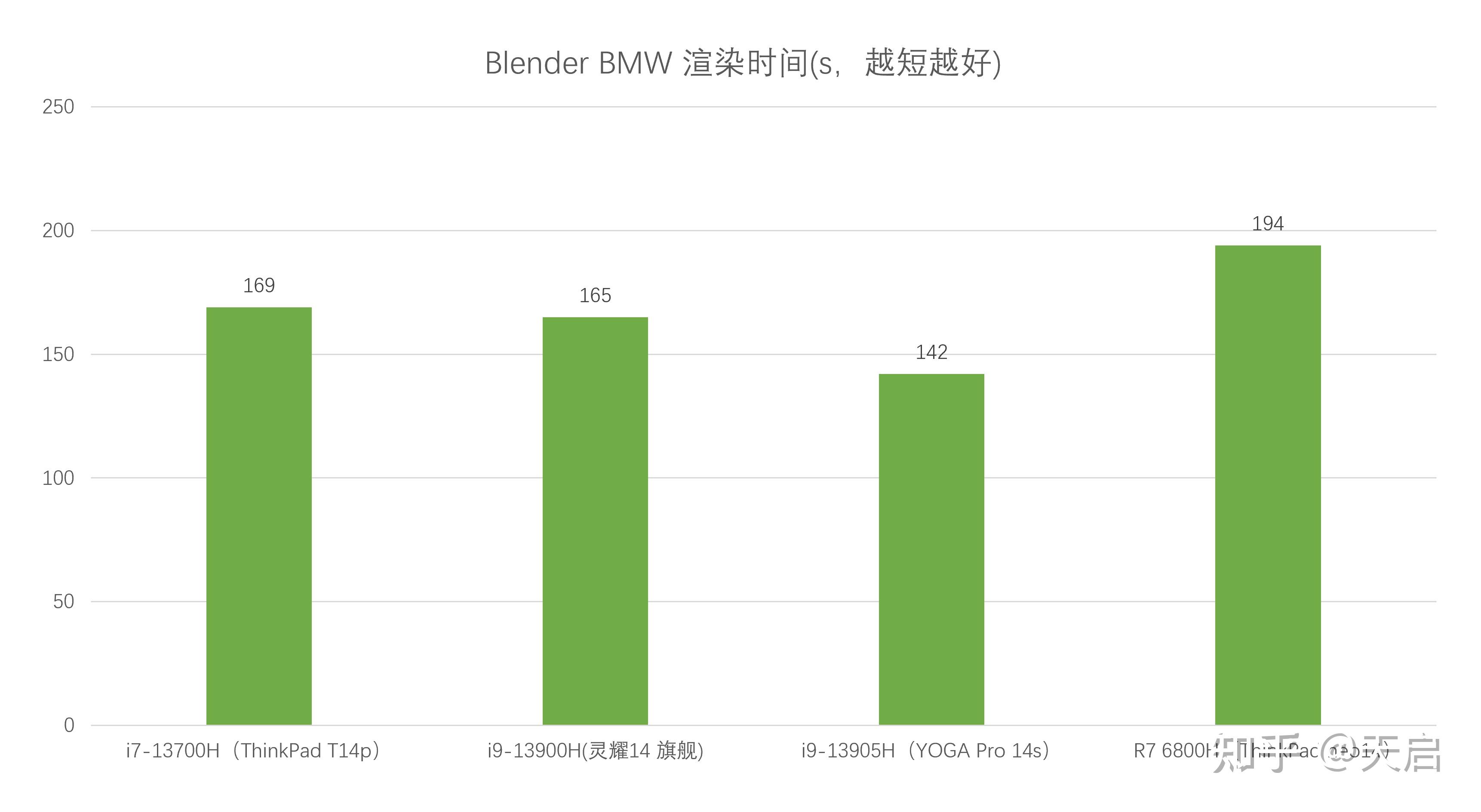 而在具体应用的CPU测试中,我们选择了Blender的模型渲染作为参照基准。搭载i7-13700H的ThinkPad T14p仅用了169s即完成了渲染。