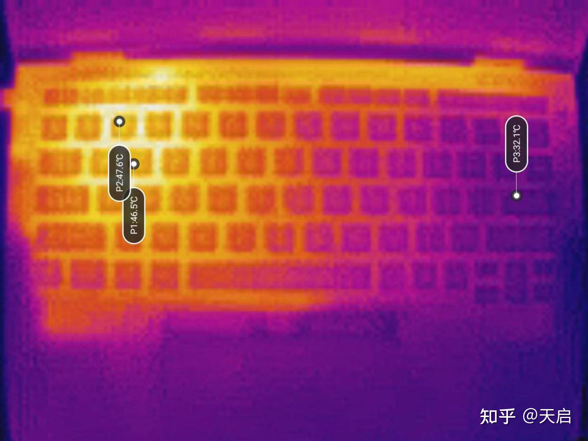 虽然性能释放确实很激进,但是本机的表面温度表现确实就只能说是一般般了,单烤20分钟后,WASD区域的键帽温度已经达到了46/47度,手触摸时已经有了明显的热感了。这说明本机散热的布局还是有很大的进步空间的。
