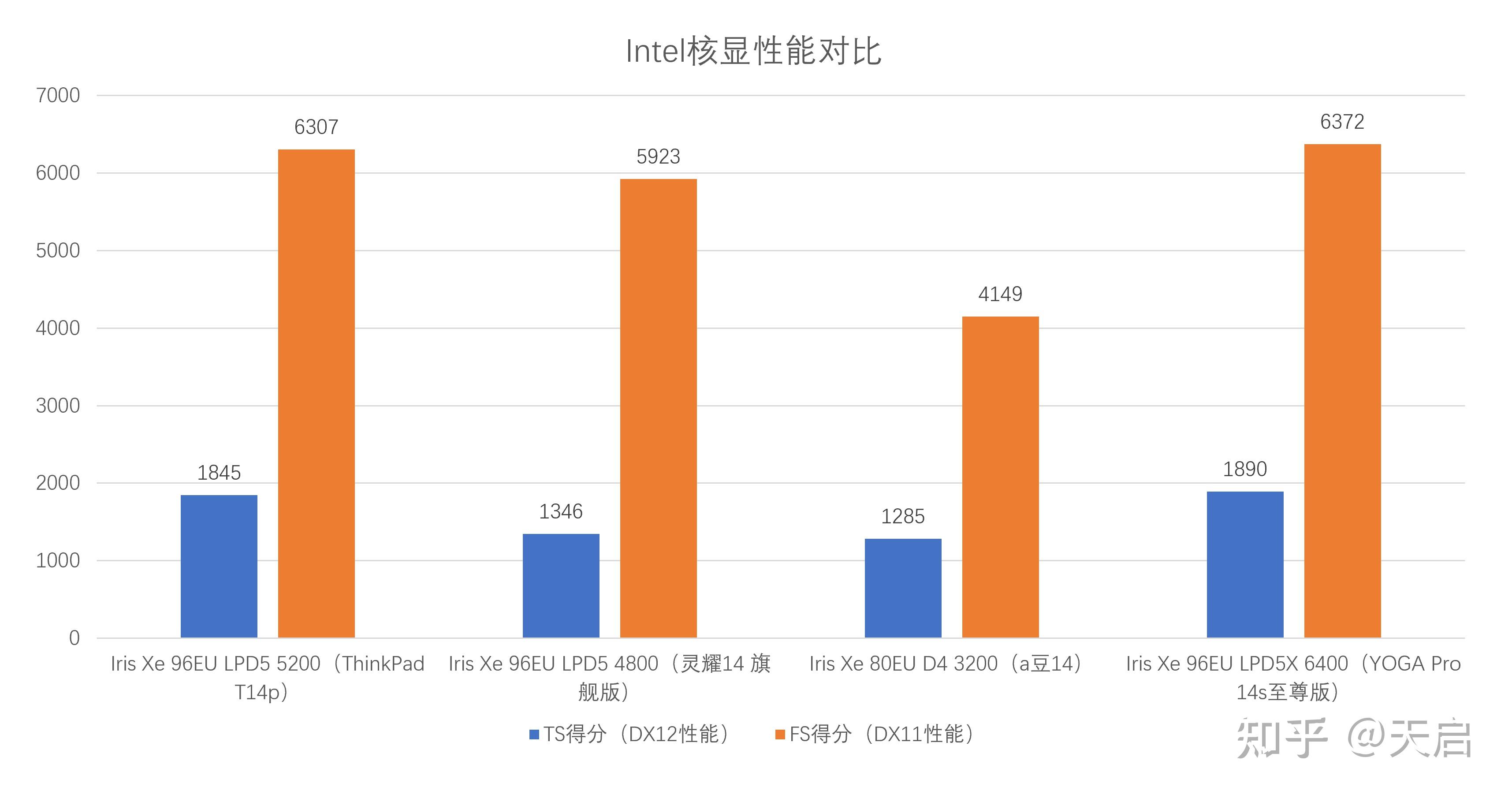 简单对比一下,就能看到T14p上的这个96EU的Iris Xe核显的性能确实已经是Intel核显的中上游,明显强于一些内存频率低,机器散热也一般的同规格核显,至于D4内存+80EU的就更不说了,且向上看,做了内存超频的YOGA,在核显性能上也已经没法做到大幅超越T14p了,说明对于这代的核显来说,内存带宽的瓶颈对于性能的限制实际上也已经不大了,Intel真的该更新一下硬件本身了。