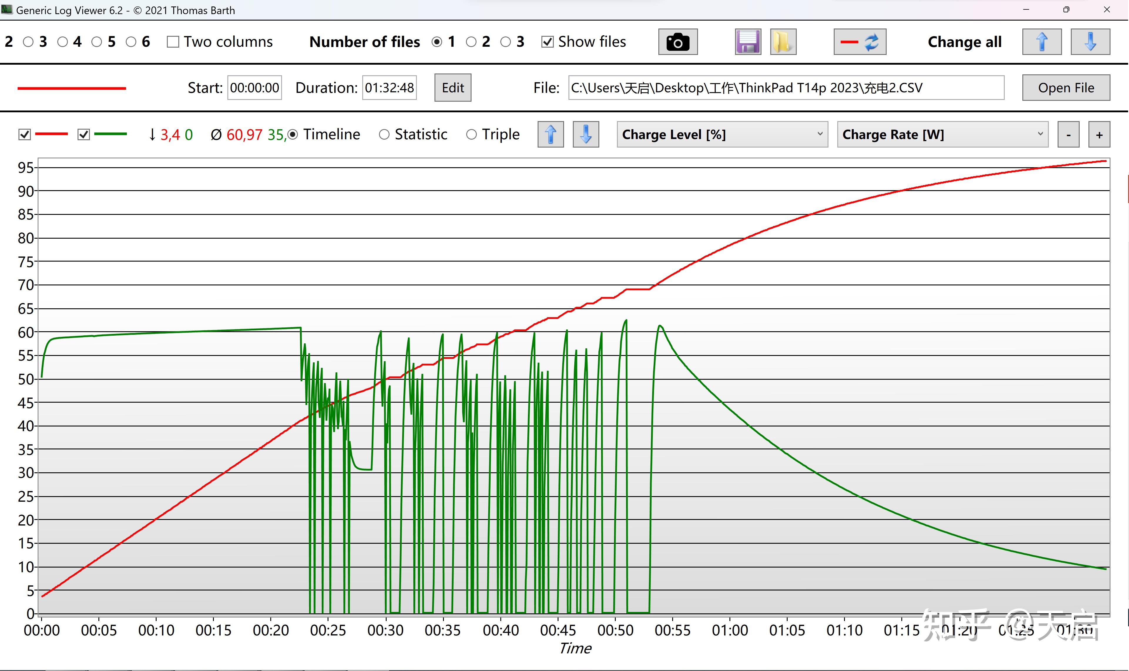 充电速度方面,使用原装的100w PD充电器。ThinkPad T14p在开机状态下用一个半小时从4%冲到了98%,1小时能充到78%,速度还是很不错的。
