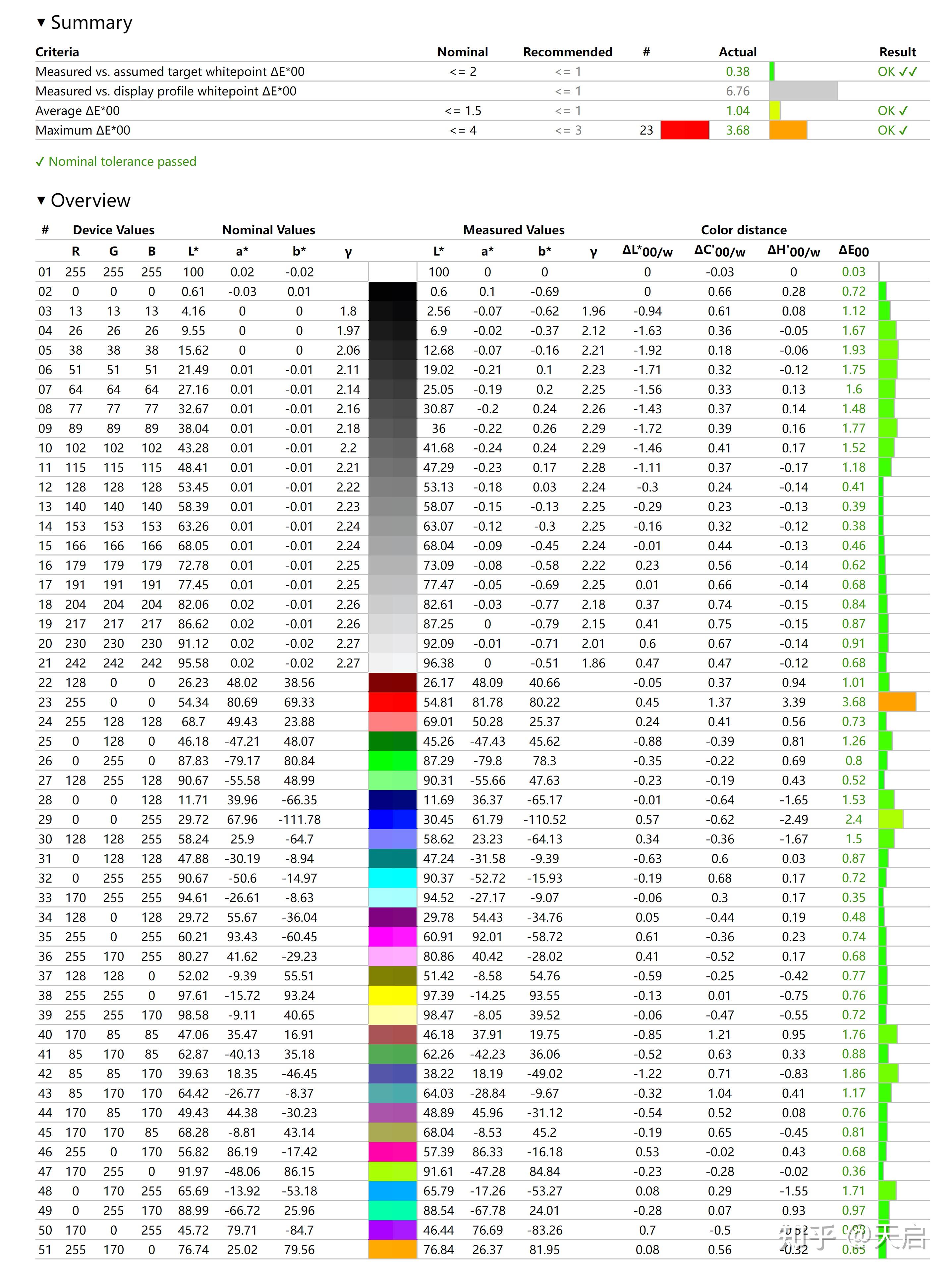 因为色域覆盖高,校色后的色准方面表现也很不错,平均ΔE只有1.04,但是最大ΔE受到了红色偏移的影响,达到了3.68,这个颜色的色准表现稍逊一筹。
