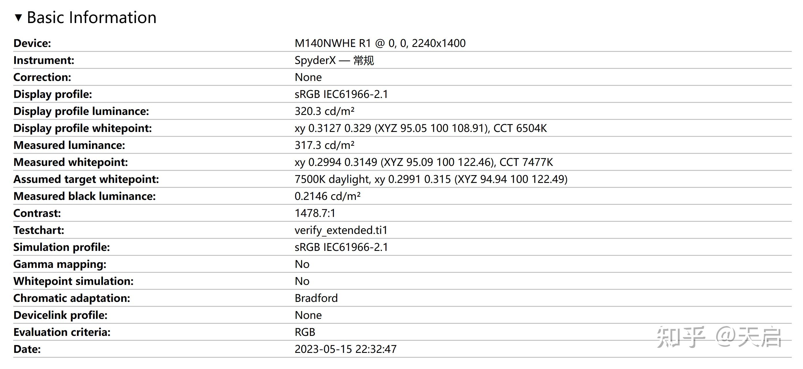 用Display Cal软件搭配蓝蜘蛛X校色仪对屏幕进行测试,ThinkPad T14p上的这块屏幕的实测最大亮度为317.3尼特,对比度1478.1:1,相比300nit的标称值,亮度部分超出了一些,对比度也不错,并且还是雾面的表面处理,因此在强光环境下观看视频时表现也算不错。
